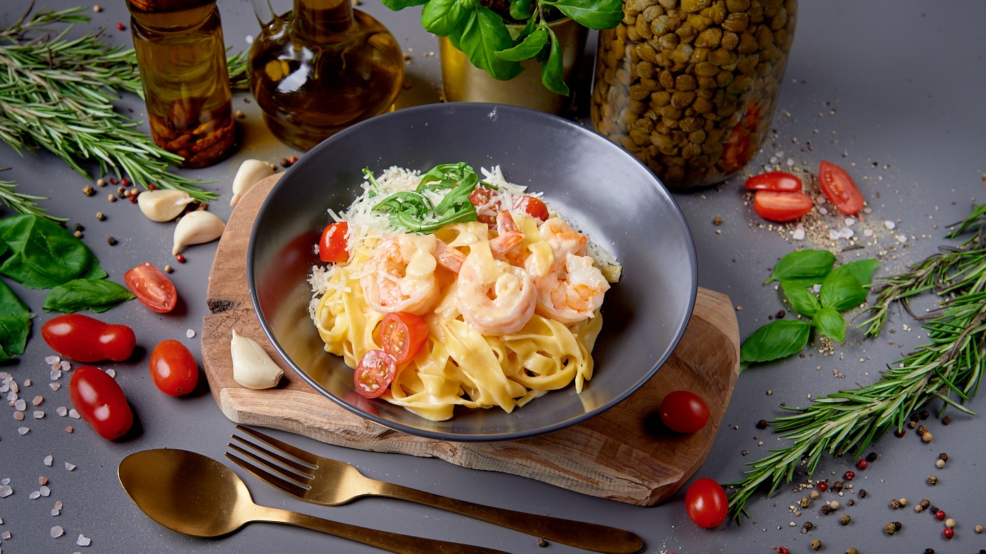 ser mozzarella, krewetki 3 szt., oliwa z oliwek, kapary, papryka grillowana, sos pesto, mascarpone